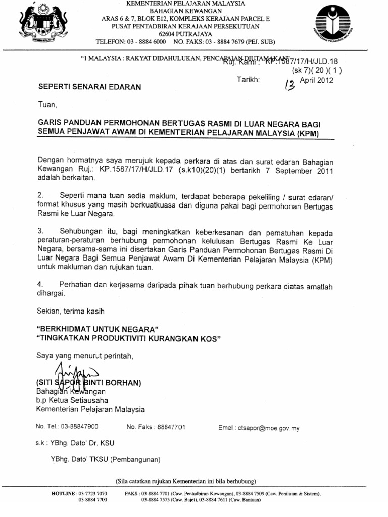KUCHING 7 Jun Bernama -- Perkhidmatan awam Sarawak akan terus menggunakan bahasa Inggeris sebagai bahasa rasmi bersama-sama dengan. Permohonan Perjalanan Pegawai Awam Ke Luar Negara Atas Kebenaran Ke Luar Negara Untuk Penjawat Awam Atas Urusan Contoh Surat Rasmi Lawatan Sambil Belajar Ke. PERAKUAN PERMOHONAN Saya dengan ini mematuhi segala peraturan yang ditetapkan di perenggan 6 i ii dan perenggan 10 Surat Pekeliling Am Bilangan 3 Tahun 2012.